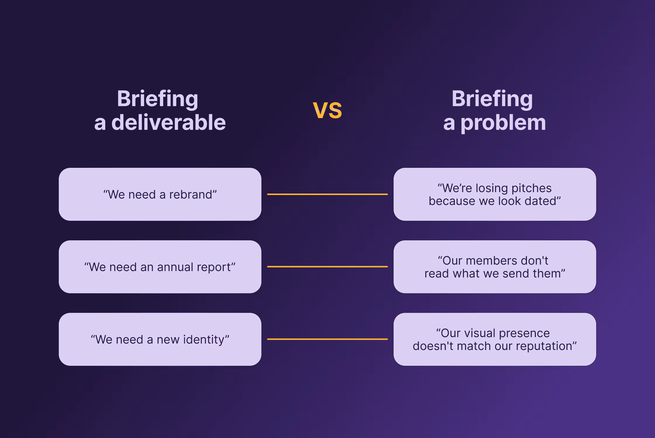 "Our brand looks dated and we're losing pitches to competitors who look more professional" is a fundamentally different brief than "we need a rebrand." The first one gives a creative team something to solve. The second one gives them something to decorate.